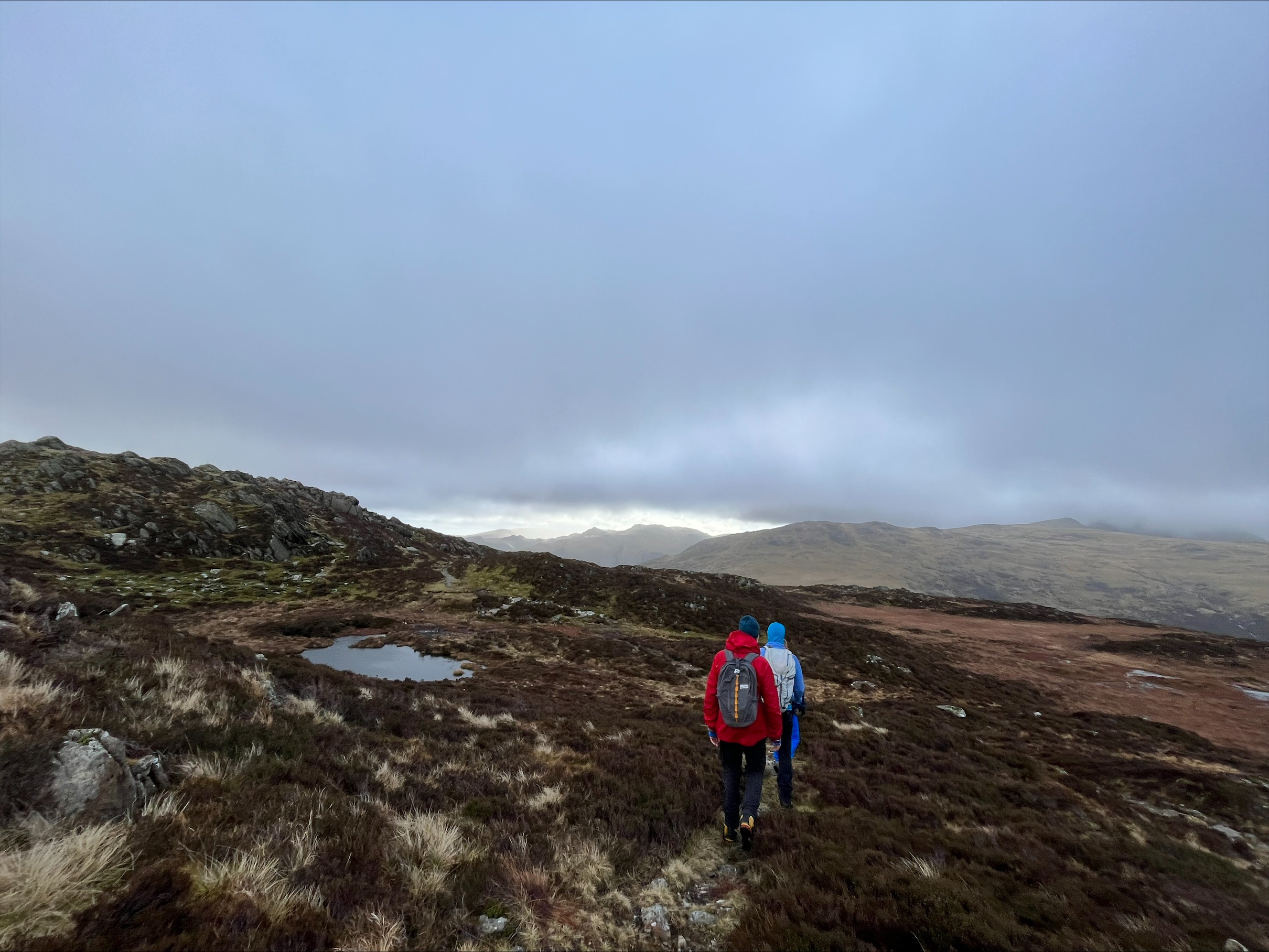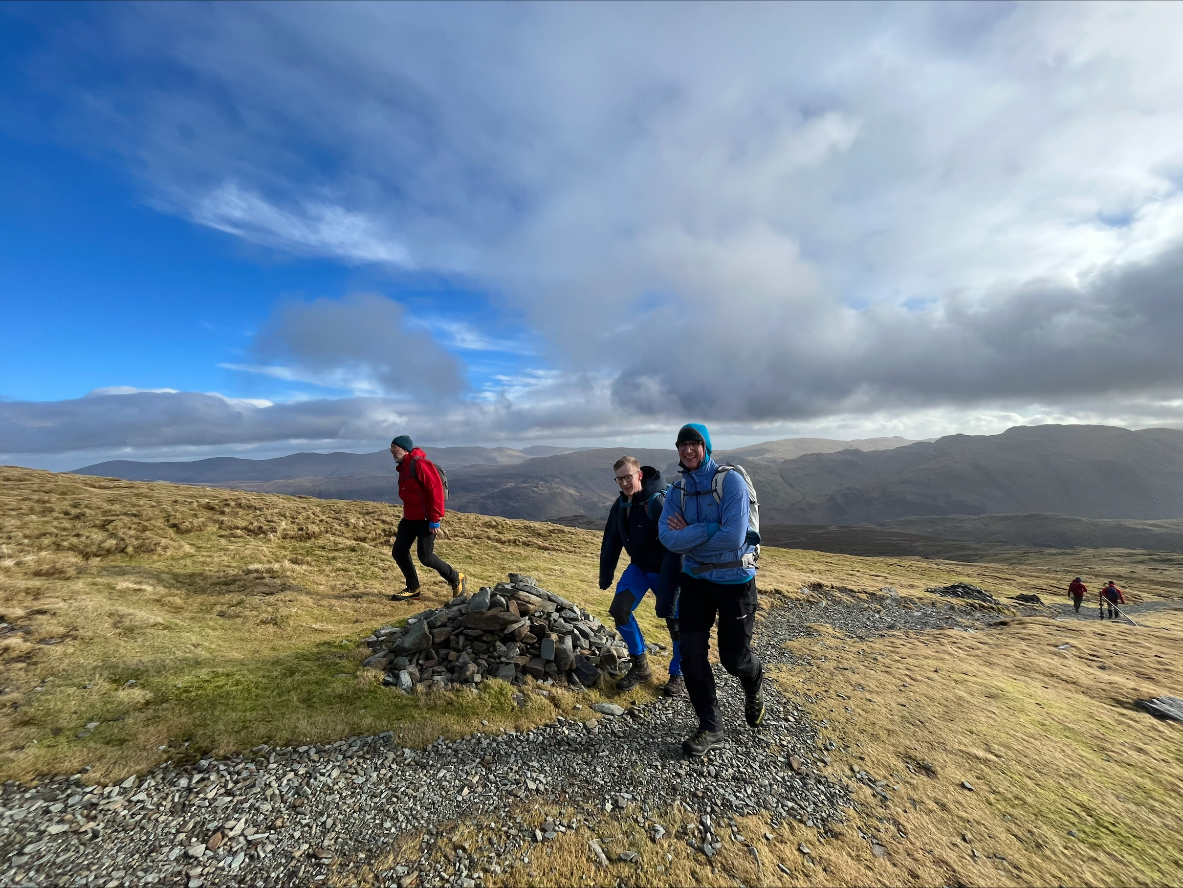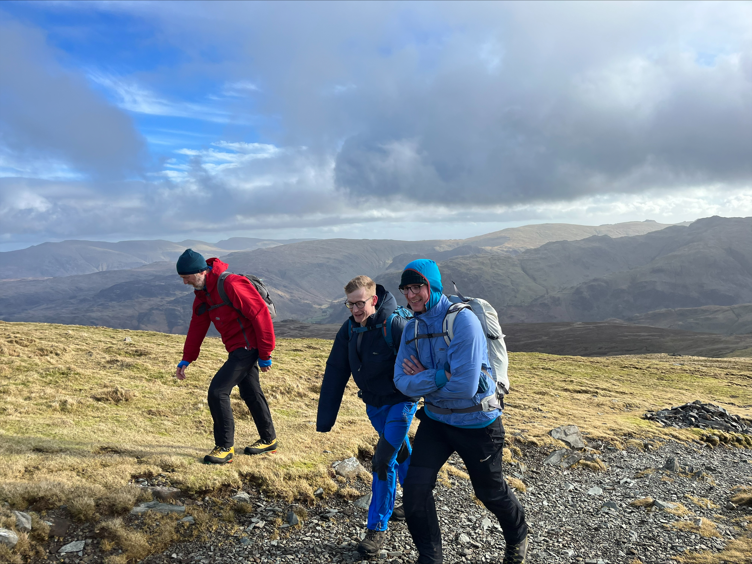 We started out walking from the Bridge Hotel Saturday morning along the lake towards the climbing hut to collect several others who’d stayed there overnight. We were well prepared. We’d checked the weather several times that morning with only a bit of wind forecasted. We were confident we’d hiked in heavier winds, and that this would be fairly tame. We also had a great route planned, up to along Fleetwith Edge up to Fleetwith Pike and further onward to Honnister Pass, and then back via Dale Head, Hindscarth Edge, and Littledale Edge. There was also an option to descend via the roadway from Honnister pass depending on how everyone felt.