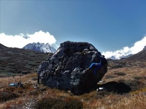 The next day was to base-camp, nearly 1,000 m higher. As we ascended the shrub turned to grass and the air thinned. Amongst river crossing and sighting of ‘blue’ sheep we stumbled across a giant rock. Our rock climbers were delighted. Bouldering competitions entertained us as we lazed in the intense sunshine catching our breath. As morning clouds cleared huge snow mountains filled the landscape culminating in Kanchenjunga at over 8,500 m. A little further on we arrived at our top campsite where we were met with hot lemon juice and biscuits. It was a truly stunning place and well worth the difficult trek. This was to be our home for the next three nights. The large igloo-style expedition research tent was set up and as many worked others played an entertaining cricket match with Sherpas amongst the tents and rocks.