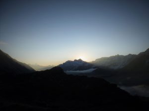 Despite close medical attention, one person with acute mountain sickness had to descend early. With assistance from two of us and Sherpa guides carrying oxygen she made the 1,000 m descent to Yabuk. The descent was successful and rapidly reduced symptoms giving her a good night’s sleep before the rest of us descended the following day.