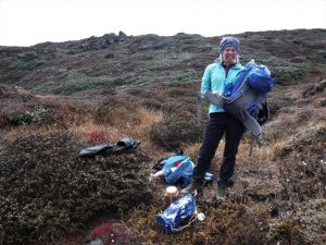 With around 60 crew helping, it became apparent what a huge operation this was. Bags were weighed and the porters set off with our experimental equipment, camping gear and personal belongings. We were given a pack lunch (curry of course) and sent on our way along the river. Scrambling over landslides carrying lunch proved somewhat tricky but we managed to find a small clearing to hurriedly eat, with many worrying about leech attacks! But the was beautiful. It followed the glacial river up through a primary spruce forest and the rain held off until the last half an hour. We arrived to find that porters had put up the mess and sleeping tents and we were welcomed with hot chocolate and snacks. Due to the many landslides and difficult path, those with heavy or wide loads had really tough ascents. Sherpas with head torches were sent down to help light their way. Quite a few of the experiment boxes were delayed, so urine collection was put on hold. Given the really tough day for the porters we decided to have a rest day allowing the fittest porters to carry things to the next camp.