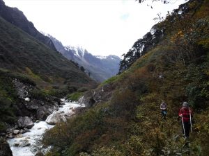 The following day was a short trek to Jakthang Camp (3,240 m), beautifully situated beside a fast-flowing river. Having raced up the mountain through the rhododendron forests, the group arrived by 11.00 am with some free time to relax by the river before having a delicious lunch and retiring to the tents for an afternoon nap.