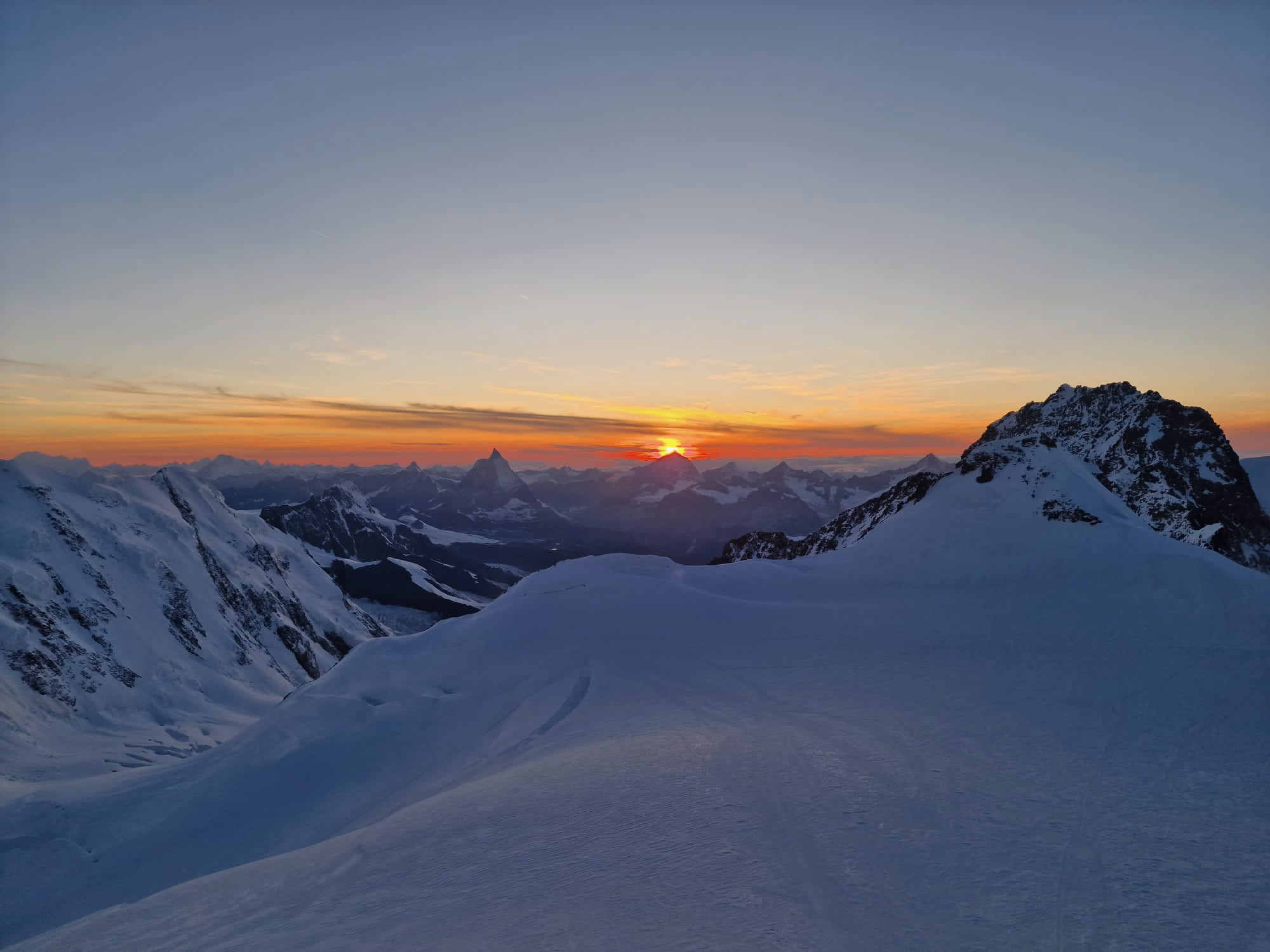 The following day brought clearer weather, perfect for our final push to the Margarita hut, which is perched precariously on the summit of Punta Gnifetti at a ludicrous 4,554 m. We divided into four groups, each roped to an alpine guide, for the gruelling glacial trek. By the time we arrived, many of the team were feeling the effects of the altitude, retiring to their bunks to nurse their headaches. Throughout the day stunning views provided ample compensation for our efforts, including a serene sunset behind the Matterhorn.