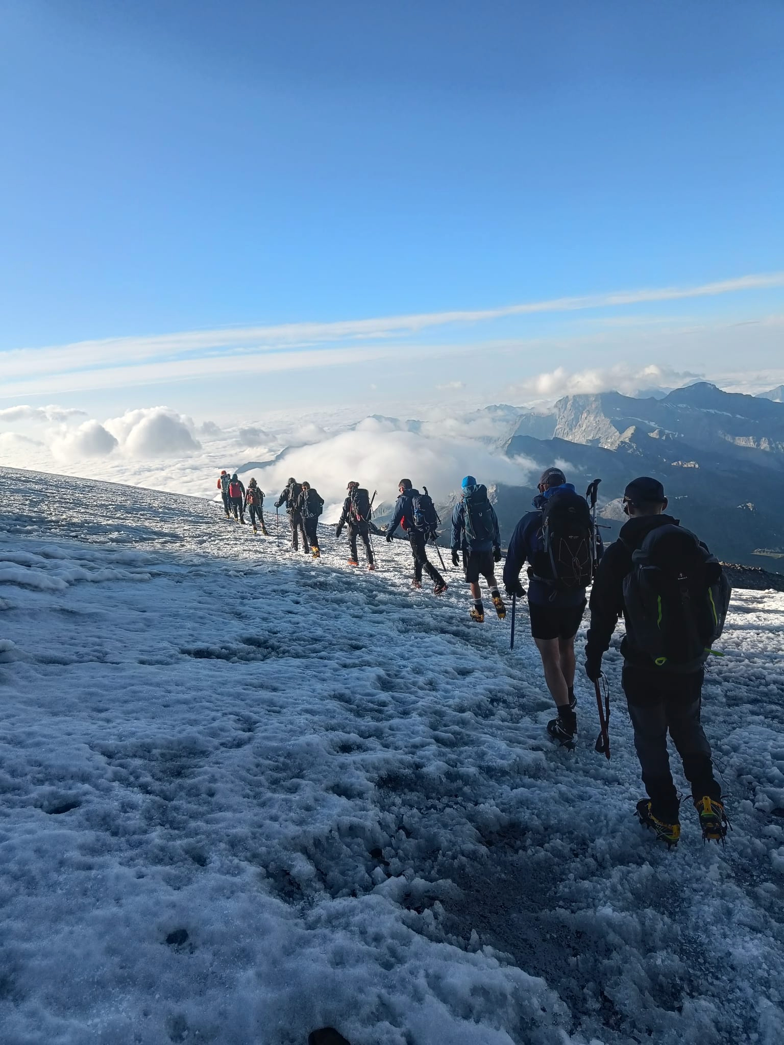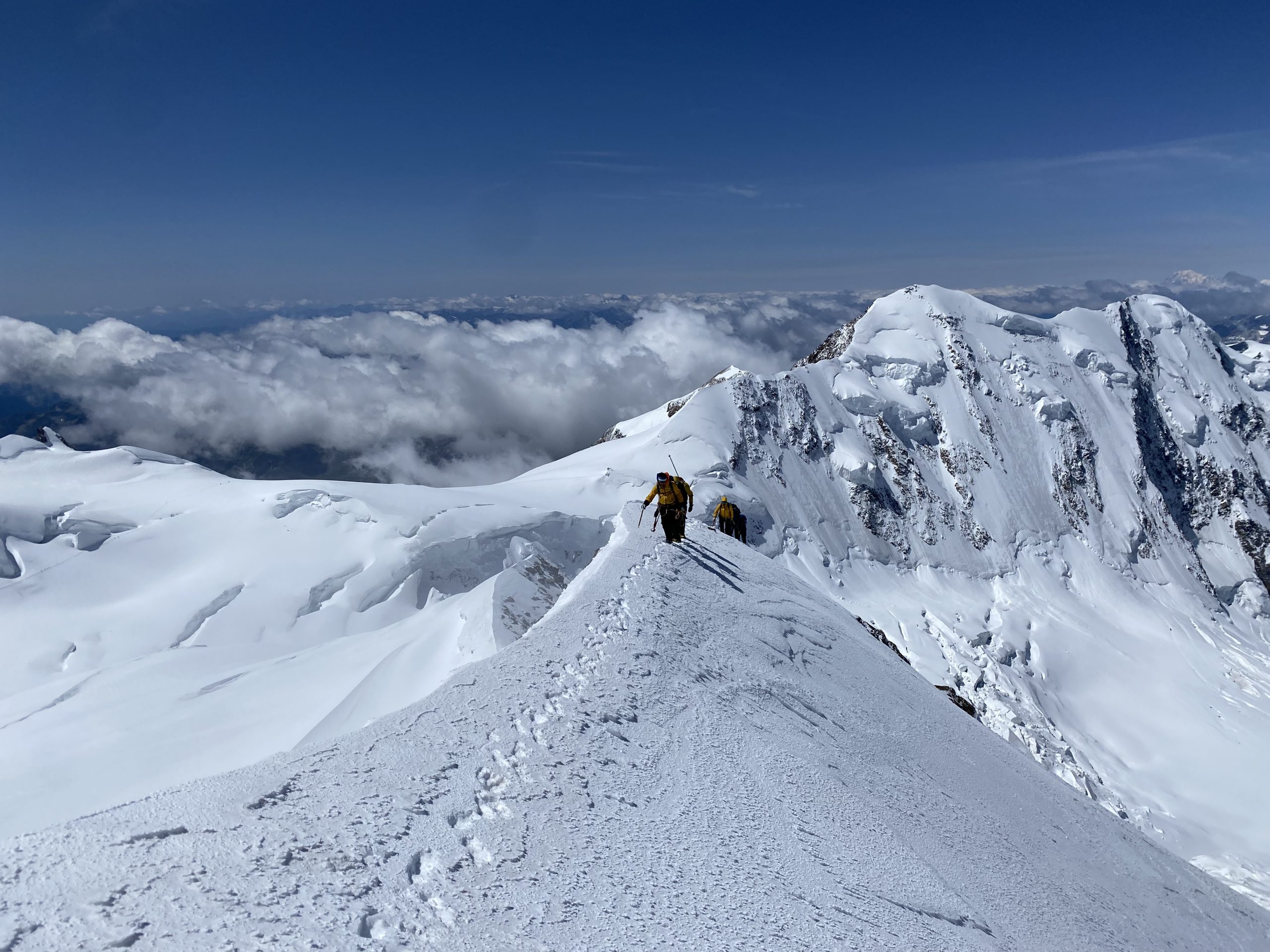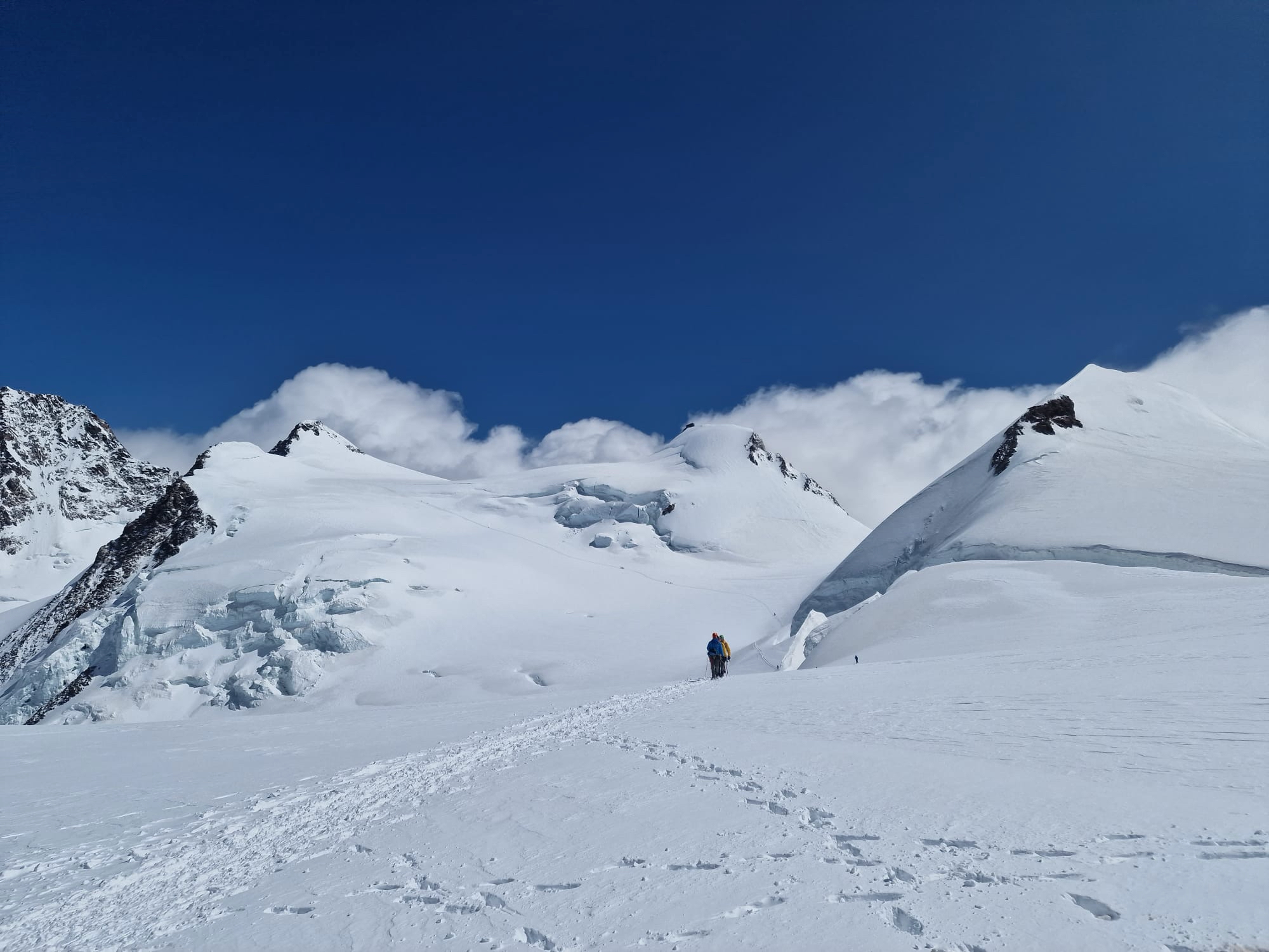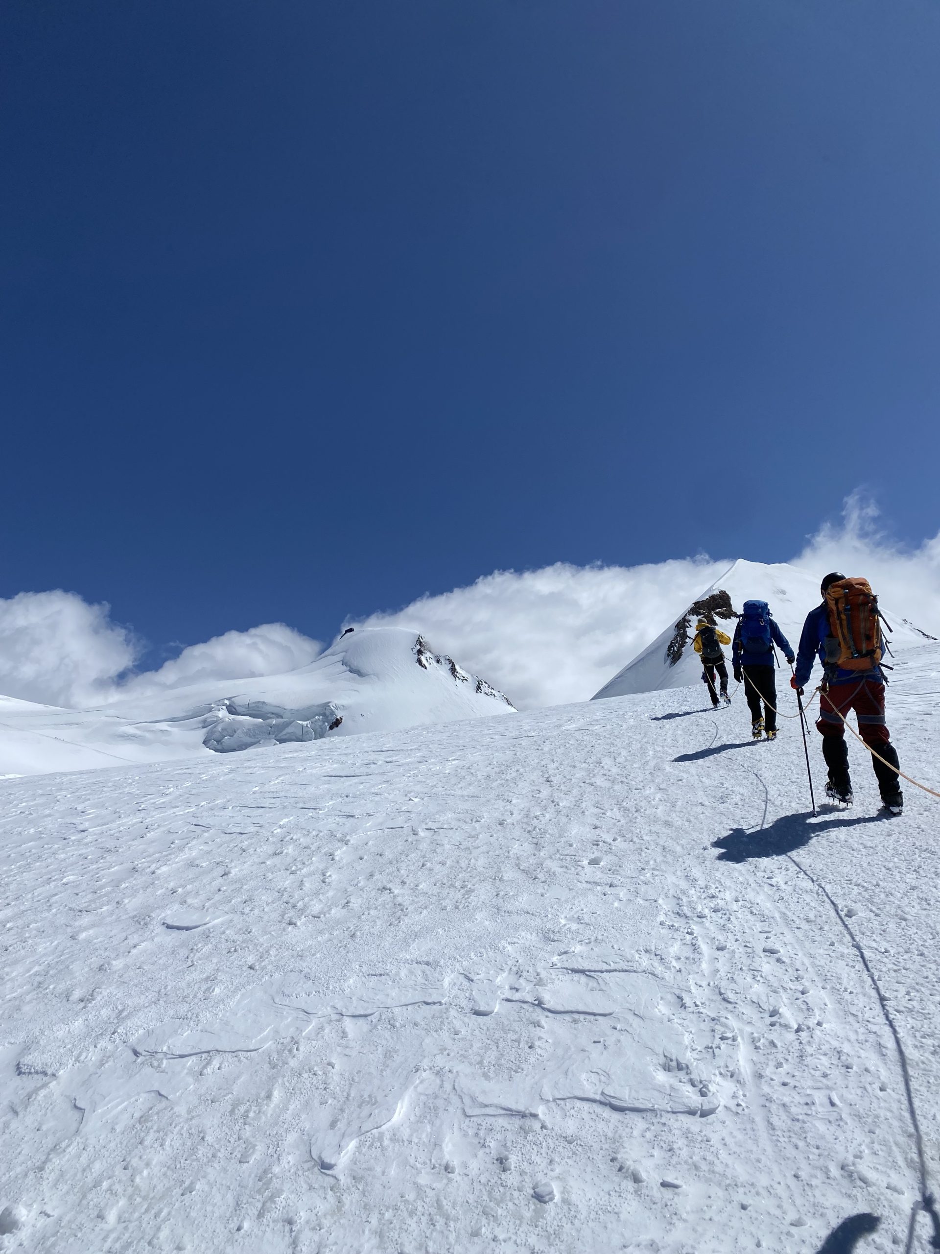 However, our first night over 4,000 m took many victims, with over half of the team displaying symptoms of acute mountain sickness by the following morning. Those of the group who were feeling well enough took the opportunity to submit two of the local peaks over 4,00 m: Parrotspitze (4,432 m) and Zumsteinspitze (4,563 m). Parrotspitze is a beautiful ridge with sharp drops either side, giving very dramatic views. For those more familiar with English hill walking, it could be likened to a significantly higher, snowier Striding Edge (Lake District). The second ascent, Zumsteinspitze, was an approximately 500 m snow-covered scramble: physically tough but immensely rewarding. The peak provided marvelous views across the rest of the Monta Rosa Massif.
